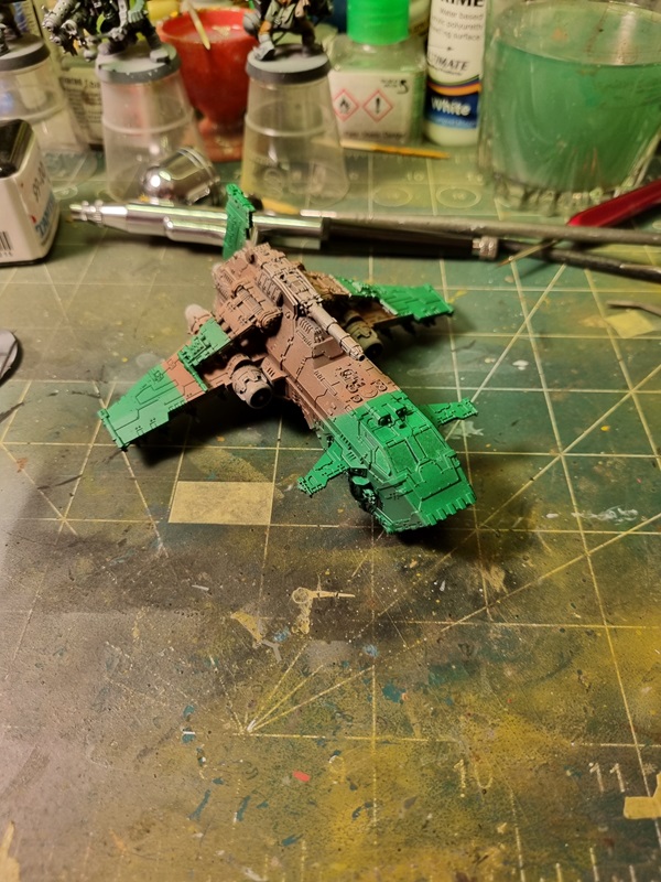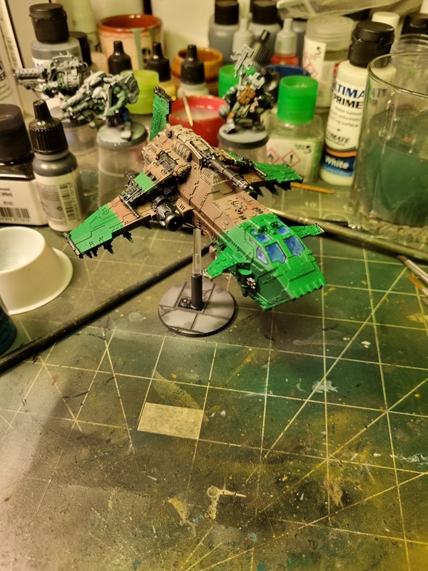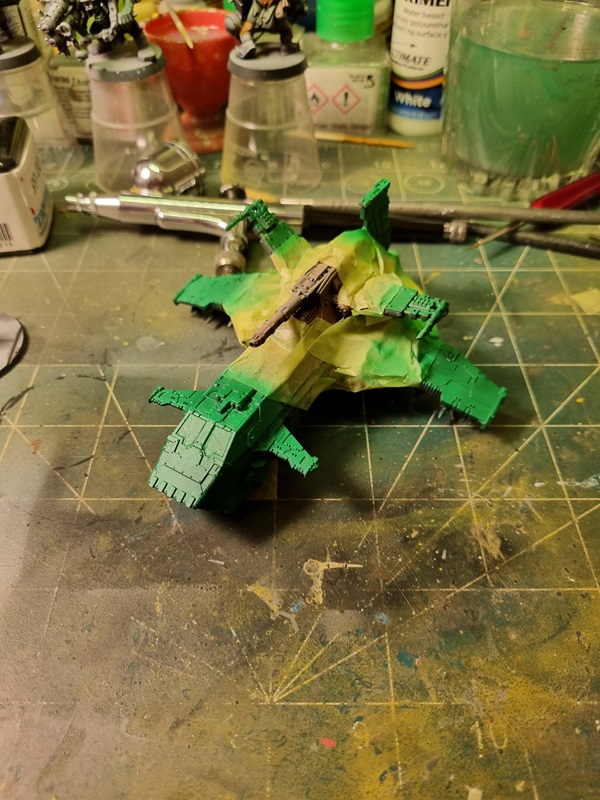 After also masking the windows, i first painted white on the areas where the first colour was showing. Then Goblin green was painted on the rest of the ship.