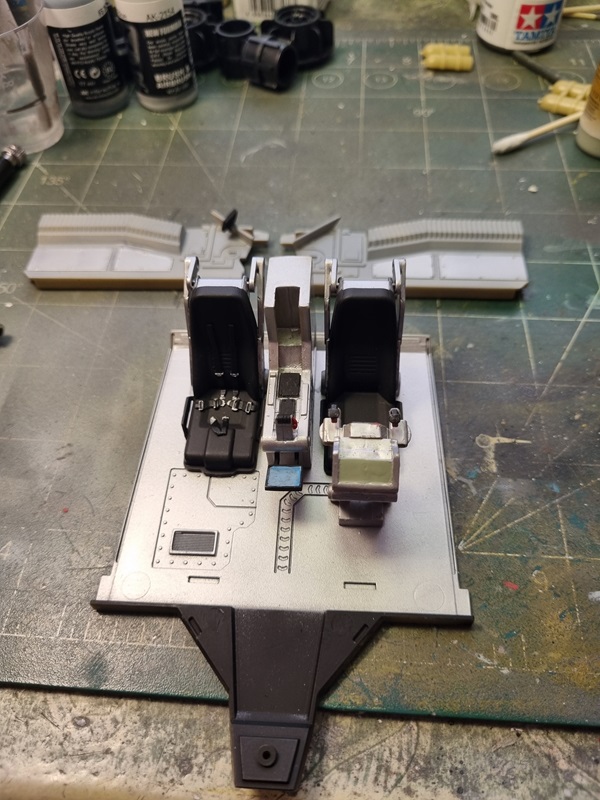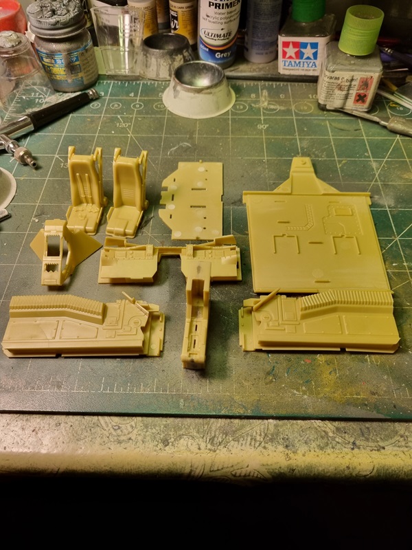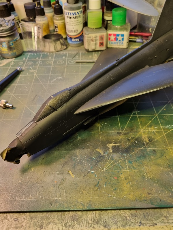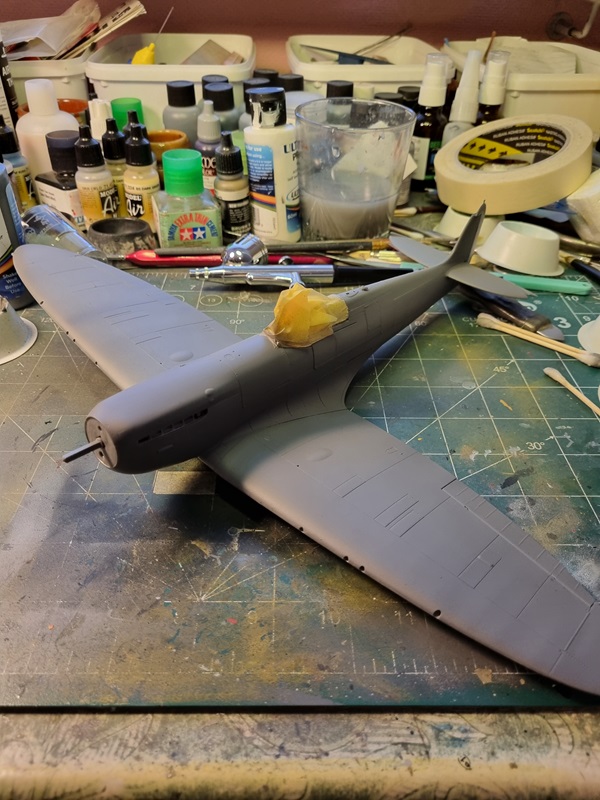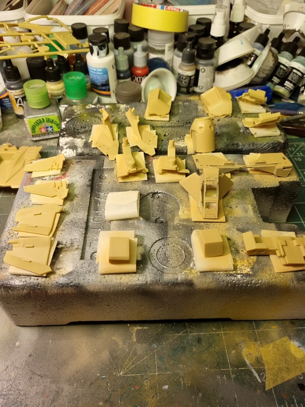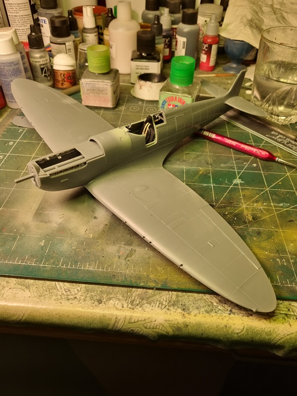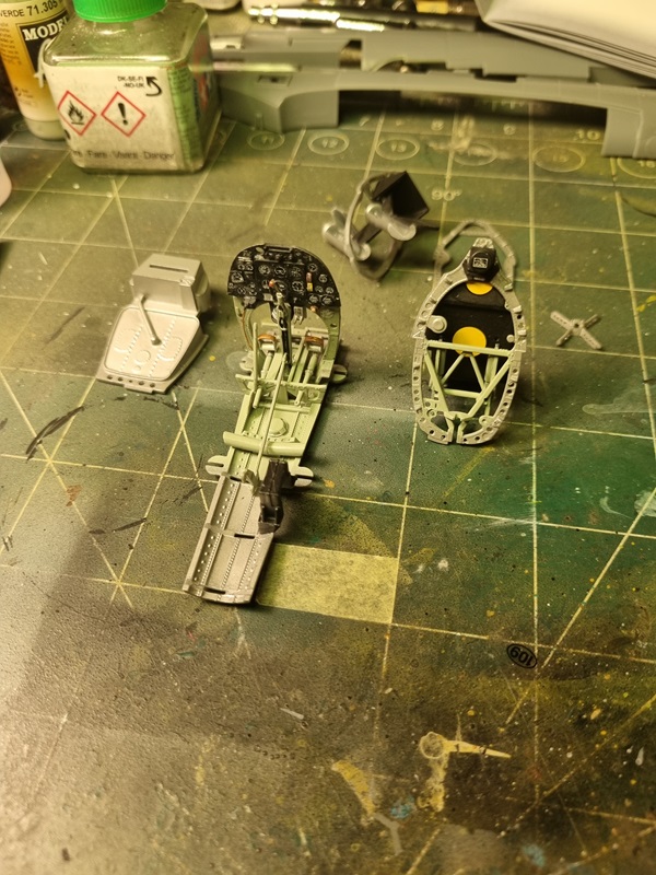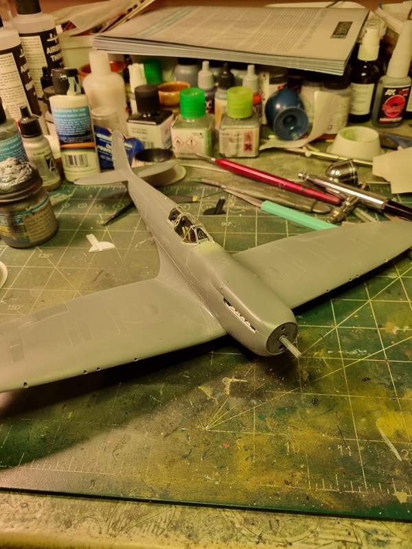 Not much left to build, but still quite a bit more to do. Masking the open canopy parts, painting the plane with primer to check for flaws, and hopefully I actually have the colours needed.