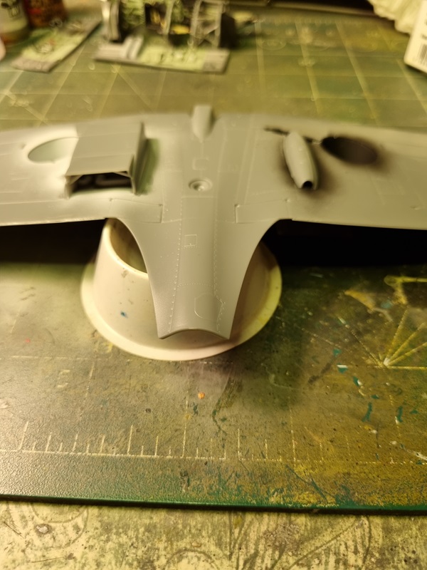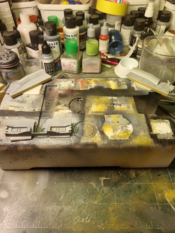 As the primer says it needs a 0.4 needle I used my Evo. Super speed painting that sadly sputtered a bit. I shifted to my cheap 0.3 airbrush and diluted the primer a bit before painting the topside. I think that went a lot better even if it took a minute to cover instead of 10 seconds with the Evo. Now I’ll let it dry for 24 hours before I can sand it and take care of a few problem areas that I spotted.