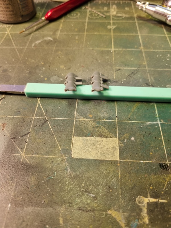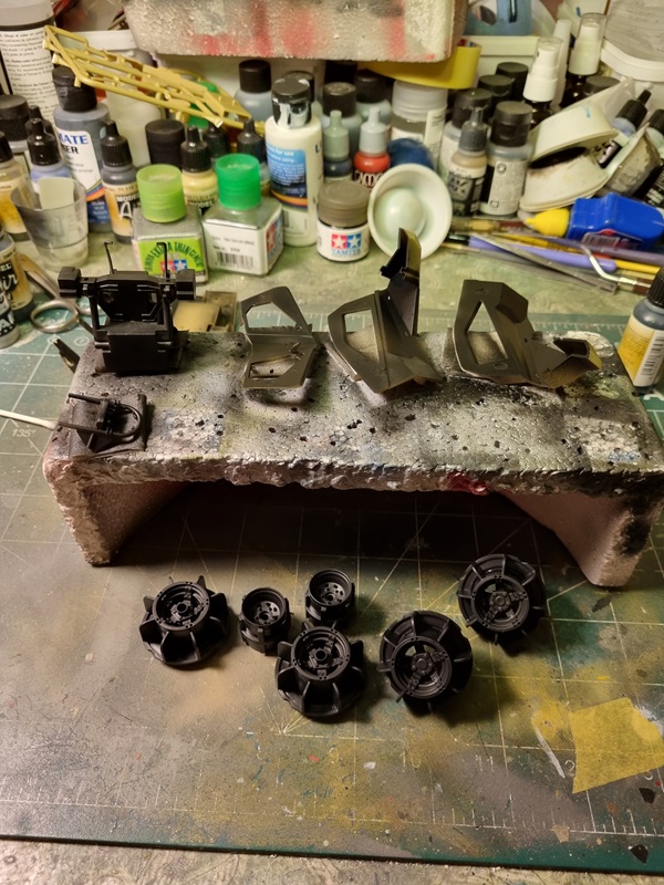 The tires will be painted with a mix of black and tire black, and the exhausts will be dry brushed with gun metal and maybe also some rust will be added.