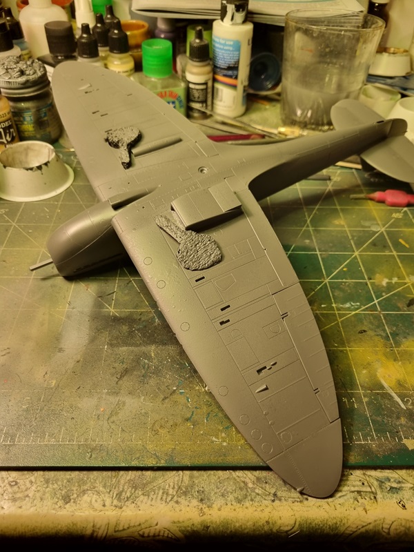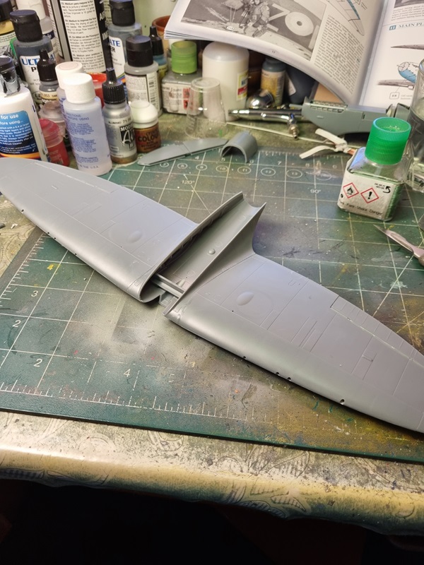 The wings was glued in place, and I must say that the fit is very tight. Checking that all sprue nubs are sanded flush and removing paint from areas where glue is supposed to go is a good idea.