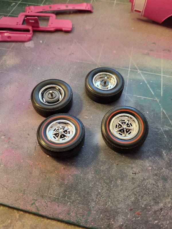 I assembled the tires and used some Tamiya black panel liner around the lug nuts.