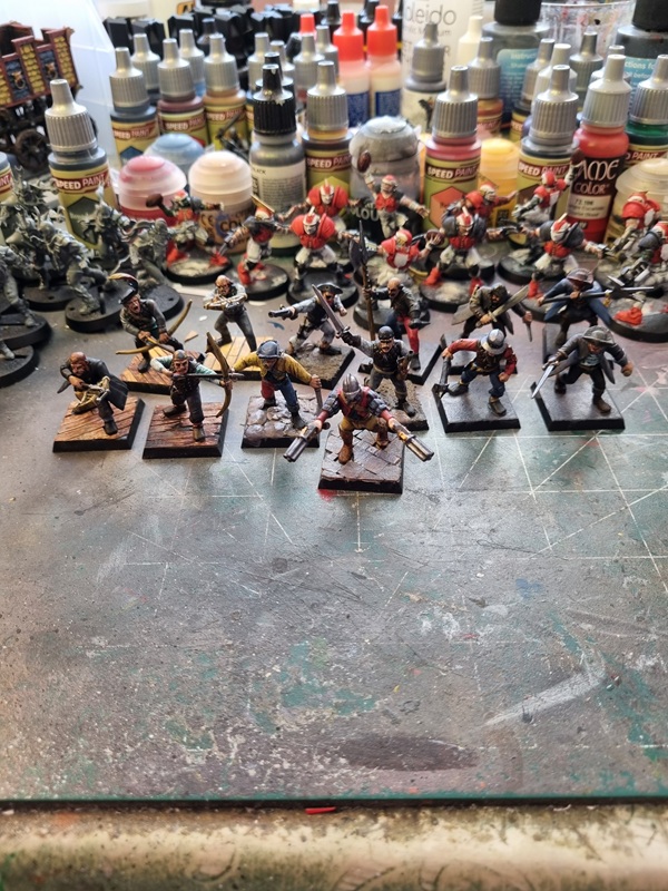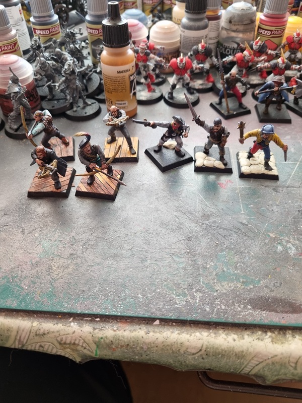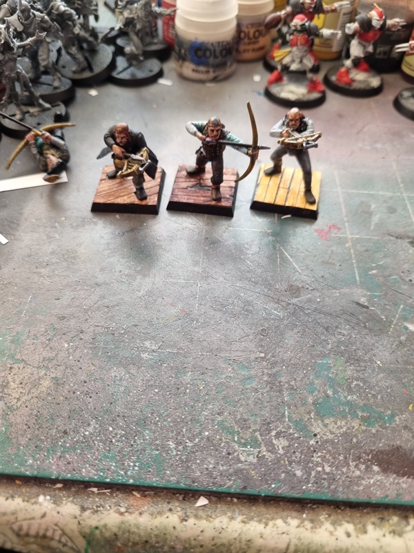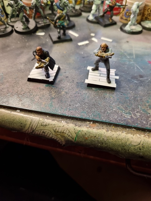 I started making bases for my Warband. I decided that my marksmen should have some kind of wooden floors. So I cut plastic stripes and glued on.